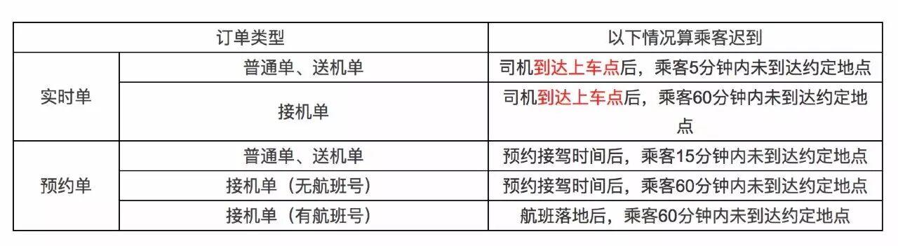 ➤ 乘客迟到(司机等候超过规定时间但乘客未到),司机可以无责取消。乘客迟到的具体情况如下: